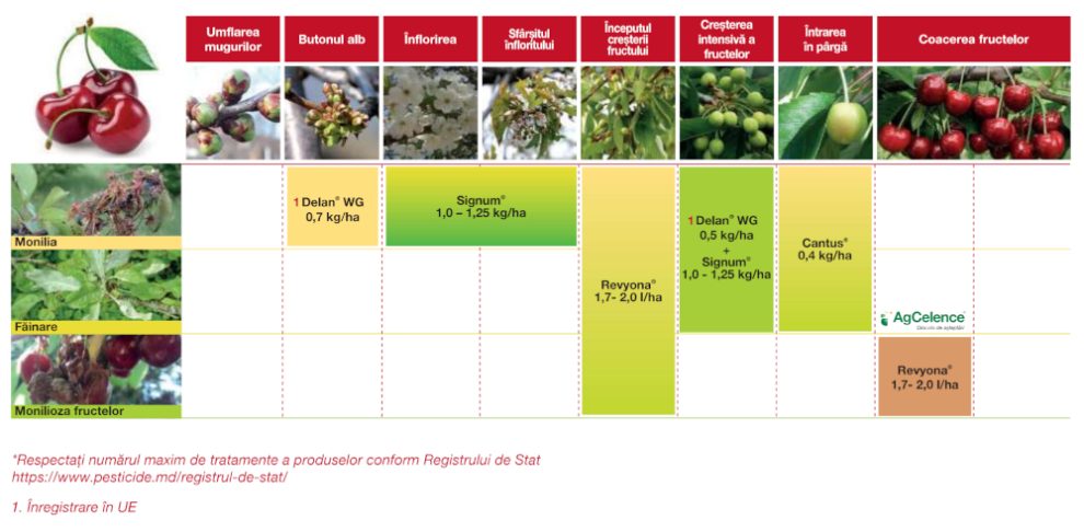 În programele dedicate speciilor sâmburoase, fungicidul Signum® se remarcă prin combinația a două substanțe active cu moduri diferite de acțiune (boscalid, din grupa carboxamide şi piraclostrobin, din grupa strobilurinelor), ceea ce susține un control foarte bun al principalelor boli care afectează cireșul: monilioza și antracnoza. Produsul are mișcare translaminară și sistemică locală. Signum® reprezintă o opțiune potrivită în perioadele sensibile ale culturii, contribuind la menținerea sănătății florilor și fructelor.