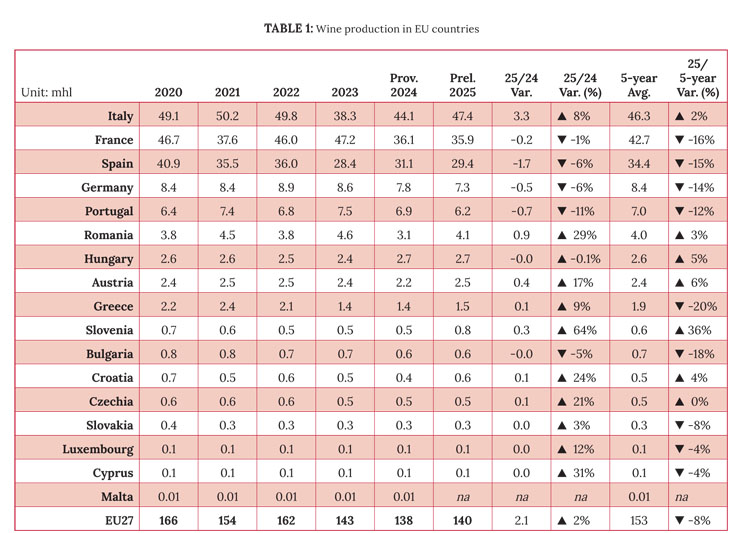 Continentul european, care a suferit puternic anul trecut, își revine, cu 140 milioane hectolitri preconizați în UE (+2%), dar rămâne cu mult sub media sa din perioada 2020-2024 (-8%), ceea ce relevă „influența crescândă a evenimentelor climatice extreme” asupra vinului în această regiune de producție istorică, notează OIV.